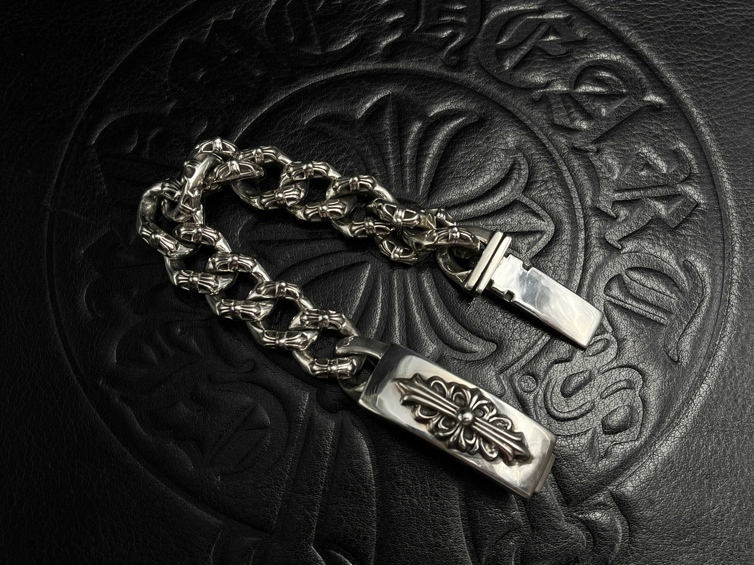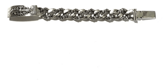 This iconic bracelet is handcrafted in 925 sterling silver, it features deep oxidation, our heavy clasp, and bold structural presence. It remains a powerful centerpiece of the Floral collection and one of the most sought after bracelets in the Chrome Hearts repertoire.