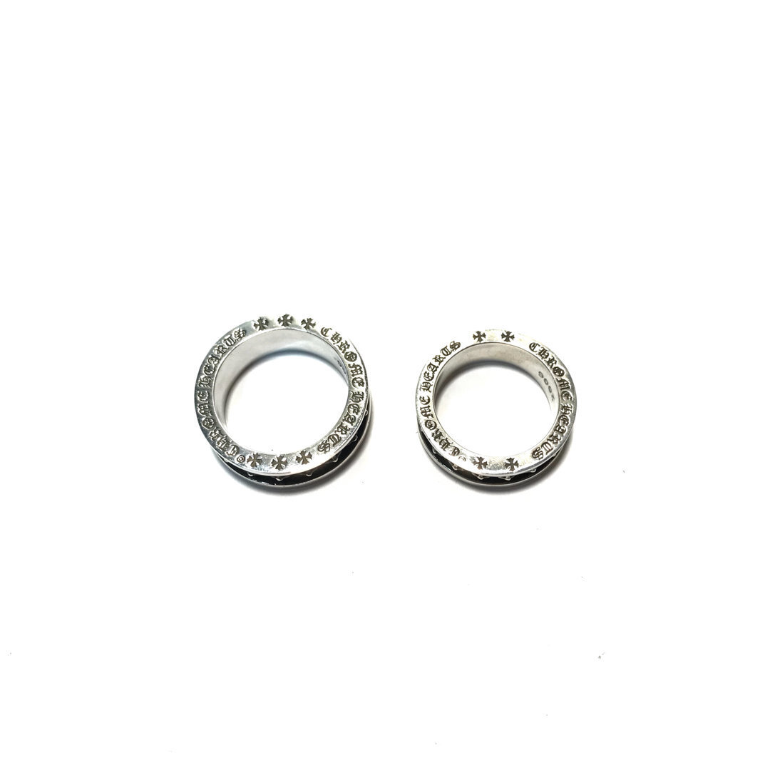 A clean and classic polished roller ring with engraved channel repeating plus motifs and signature 'CH' script on the inner band.